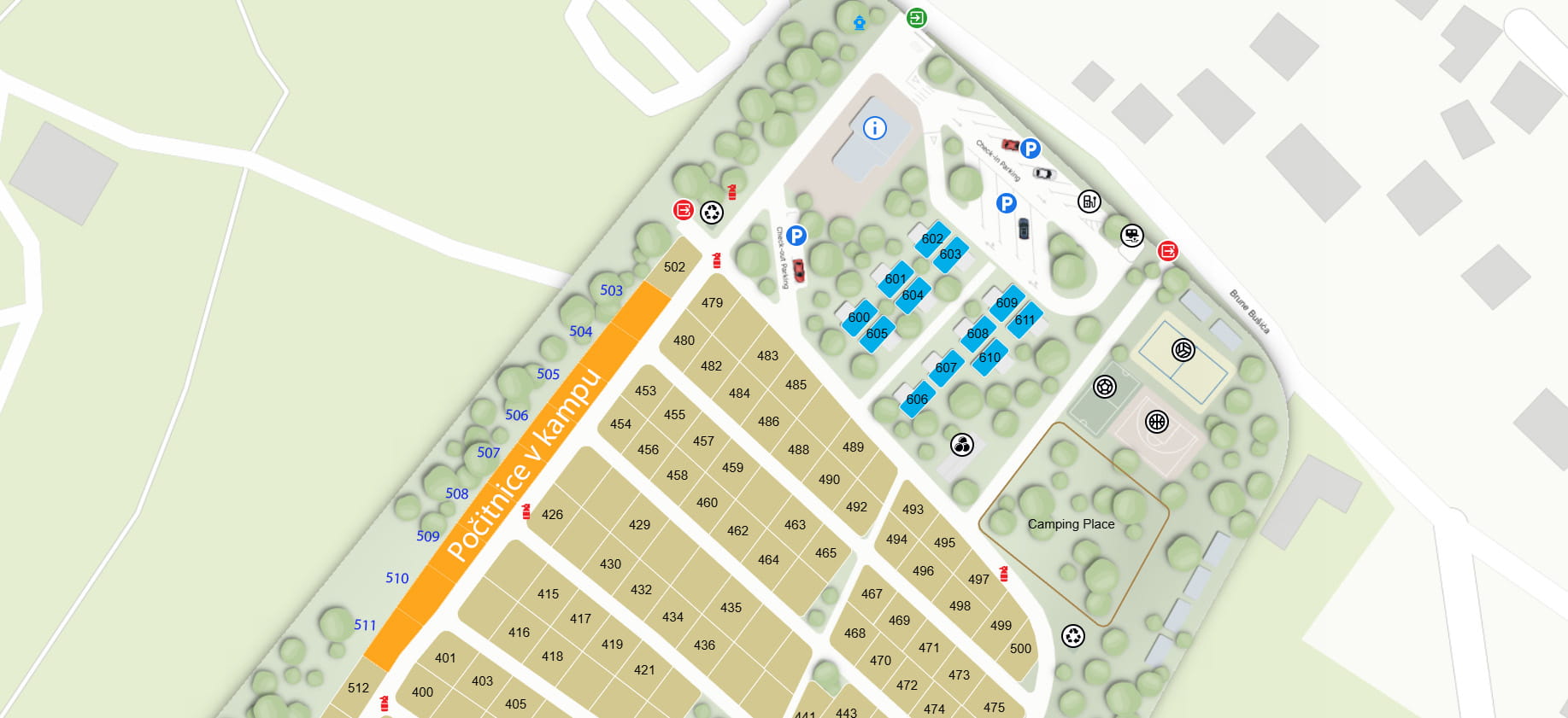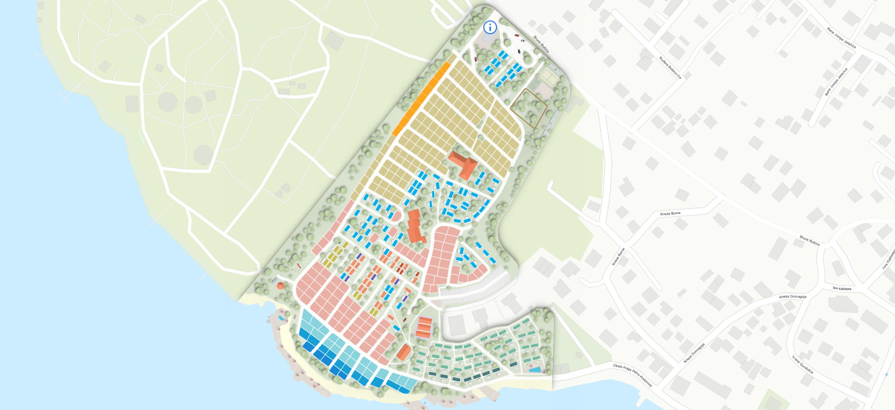 Oddaljena je cca 200–300 m od plaže, sanitarije pa so na razdalji cca 60–80 m. Postavljena je v naravni senci, ki omogoča prijetno bivanje čez ves dan.