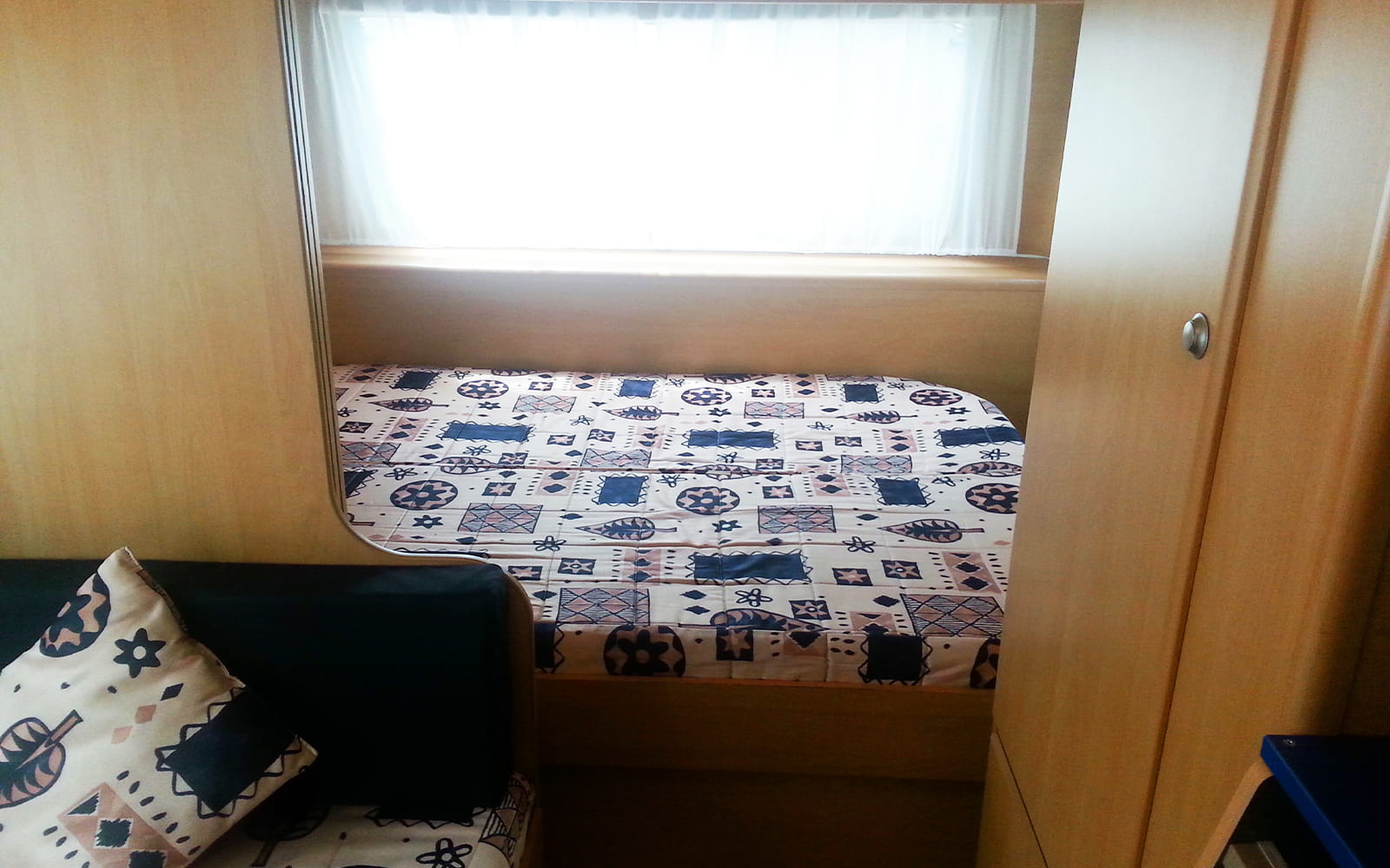 Prikolica je oddaljena cca 200–300 m od plaže, sanitarije pa so približno 60–80 m stran. Postavljena je v prijetnem zelenem delu kampa, kjer prevladuje tišina in naravno okolje.